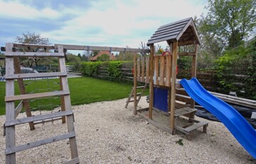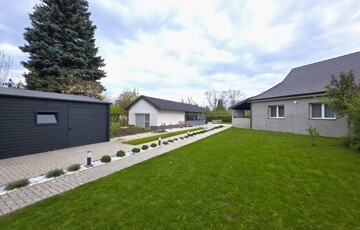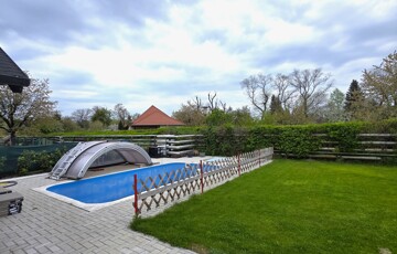 Parkosított terület automata öntözőrendszerrel, hőszivattyúval fűthető medencével, játszótérrel és kerti tárolóval.