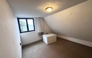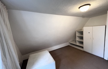 Az emeletre érve egy padlószőnyeges szoba fogad, méretre készített beépített szekrénnyel.