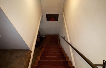 Az alsó szint jelenleg is lakható: egy kis előszobából jutunk a nappaliba, ahonnan boltíves átjáró vezet a konyhába, kilátással a kert csendes első részére.