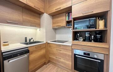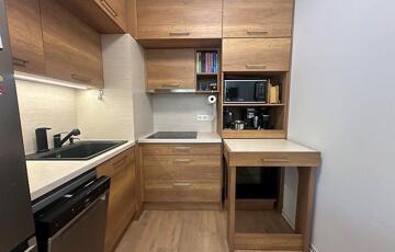 A lakás egyik kiemelt értéke az egységesen, átgondolt koncepció mentén kialakított, beépített bútorzat, amely esztétikailag és funkcionálisan is magas színvonalat képvisel. A konyha teljeskörűen gépesített.