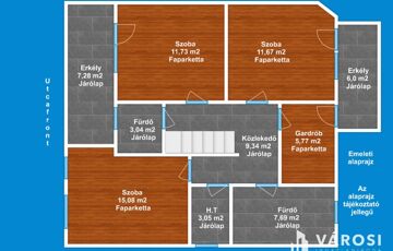 A lakás 1 db amerikai konyhás nappalival, 4 db hálószobával, 3 db fürdőszobával, külön Wc-vel, közlekedővel, előtéttel, gardóbbal terasszal, erkélyekkel rendelkezik.