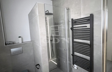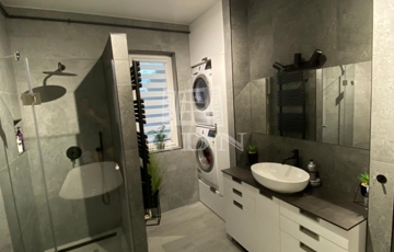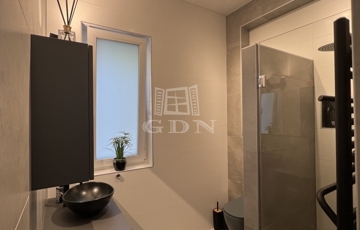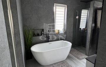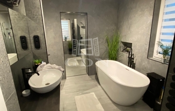 Az alaprajzhoz képest az emeleten a szülői hálószobából egy elegáns tükör tolóajtón keresztül közvetlenül is megközelíthető a fenti fürdőszoba, amely szintén prémium érzetet ad ennek a helyiségnek is.