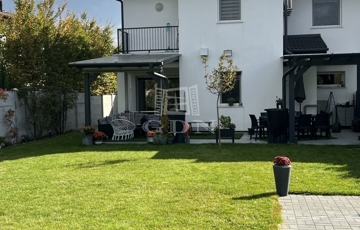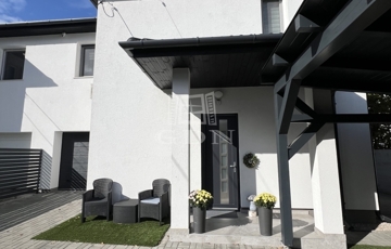 A épület elrendezése átgondolt és élhető: a földszinten csak a garázsnál érintkezik a szomszéddal, az emeleten pedig mindössze két hálószobánál van a kapcsolódási pont.