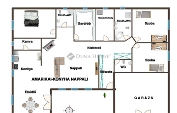Helyiségek: amerikai konyhás nappali étkezővel 3 hálószoba gardróbszoba 2 fürdőszoba + vendég WC kamra és háztartási helyiség 20 m² fedett terasz.
