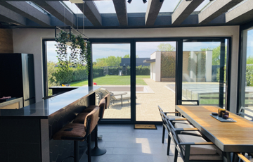 80 m²-es zárt terasz (télikertként is használható), kandallóval és pizzasütővel