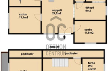 - Helyiségek az emeleten: 2 szoba, nappali, füdőszoba-WC, padlástér (tároló), erkély
