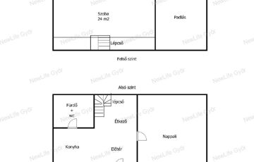 Földszinten: nappali, konyha-étkező, fürdőszoba