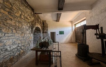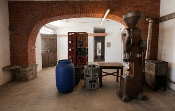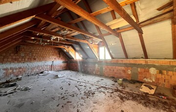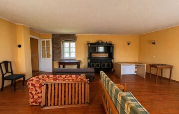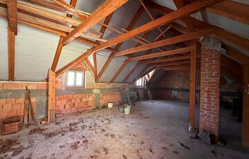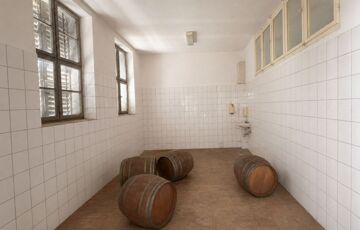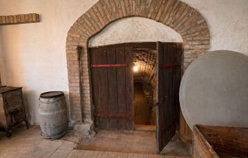 Az épület mellett található a későbbi, 100 m2- es, téglából készült rész, amely már szerkezetében is a nagyobb volumenű hasznosítást támogatja. Itt a földszinten két nagy méretű terem áll rendelkezésre, valamint két lenyűgöző, téglaboltíves pinceág, amelyek közül az egyik jelenleg beszakadt állapotú, de kitisztítva és helyreállítva különleges értéket képviselhet. Az ingatlan különlegessége, hogy a két épületrész belül, egy folyosón keresztül is összeköttetésben áll, így egységes, jól átlátható és könnyen használható teret alkotnak, ami kiválóan alkalmas például borkóstolók vagy tematikus rendezvények lebonyolítására. A helyiségek között megtalálható még egy feldolgozó szoba, két mellékhelyiség és egy tároló is. A tetőtér beépítése már elkezdődött, összesen mintegy 110 m²-en kínál további bővítési lehetőséget, amely kiváló alap lehet szobák vagy apartmanok kialakításához.