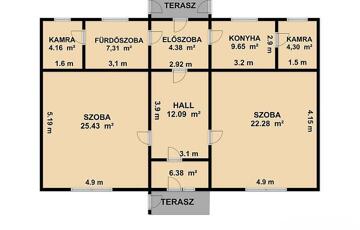 2 szoba, hall, konyha, 2 kamra, kádas fürdőszoba + WC, előszoba, 2 terasz.